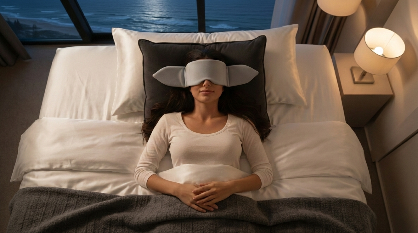 On flights or in unfamiliar beds, Lunia blocks light and adds gentle pressure to help your body relax.